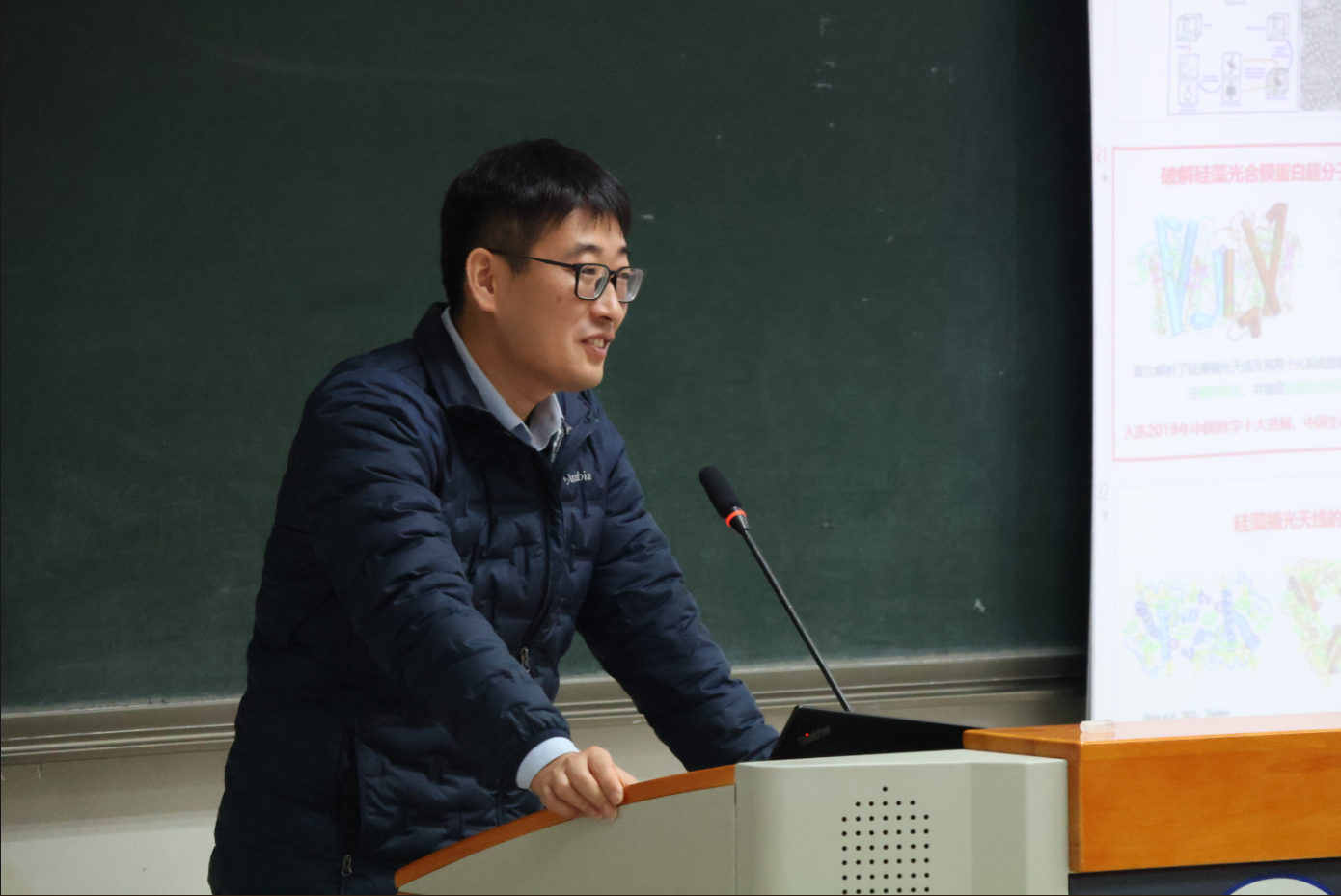 基于同学们对植物光合作用的基本认识,王文达研究员详细介绍了近年来自己的科研方向。他讲到,相较于陆地植物,硅藻在海洋中有数万种,贡献了每年海洋40%、全球20%的原初生产力,研究海洋中藻类的光合作用更有意义、也更具有挑战性。目前他的团队已经成功破解了硅藻光合膜蛋白超分子结构和功能之谜,揭示了植物环式电子传递调控能量平衡的新机制,有助于我们从光物理、光化学和生物学角度更加全面地认识光合作用。