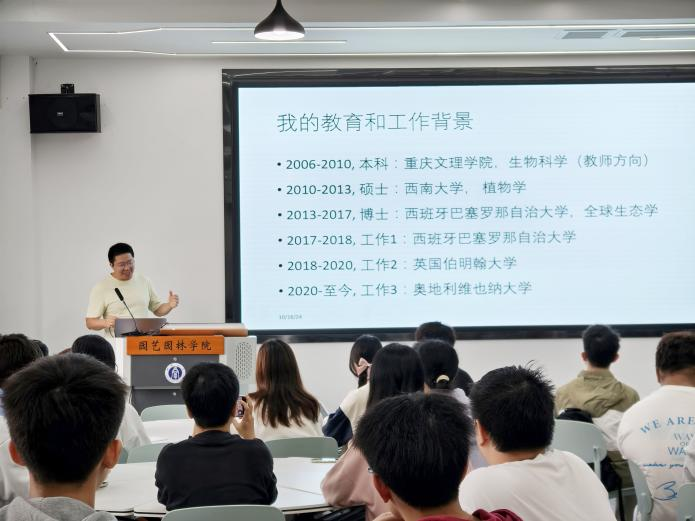 的求学经历,感谢学院领导和老师的指导与帮助。随后他介绍了自己的研究方向,多年来致力于气候变化和土地利用变化对生物多样性及生态系统功能研究并取得重要科研成果。他提出对当前科研环境的见解,并对学生们在科研道路上可能遇到的困难提出宝贵建议。