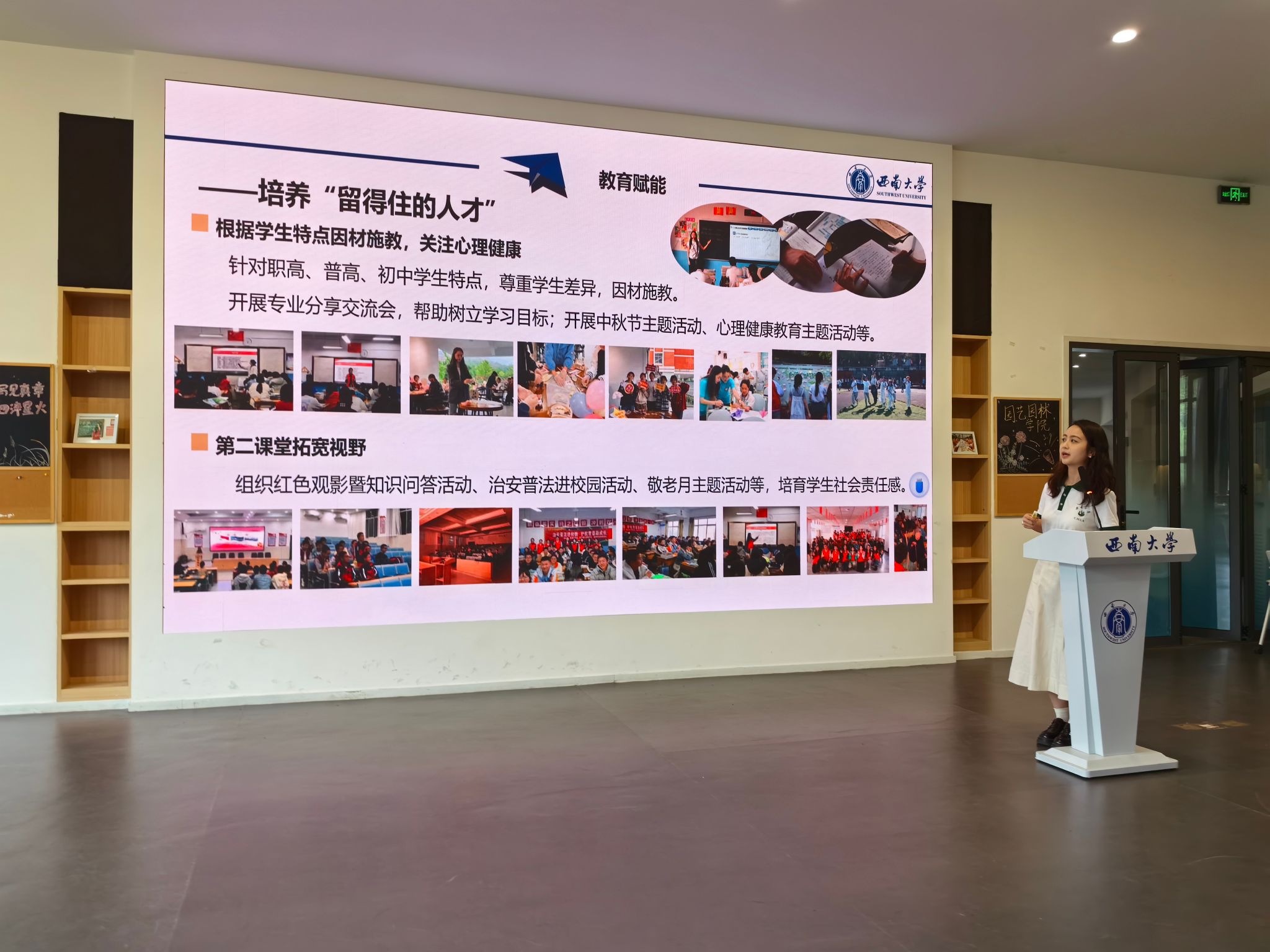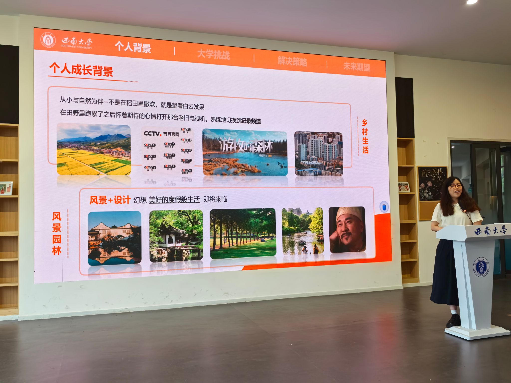 2021级风景园林专业本科生陶姝羽以“教育赋能乡村振兴”为主题,鼓励同学们学好专业知识,洞察专业之美,以专业之美成就乡村之美、青春之美,用扎扎实实的专业知识解决实实在在的“三农“问题。