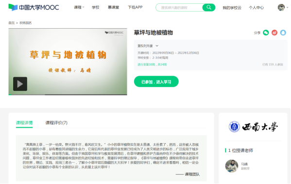 《草坪与地被植物》是一门伴随着农业科学发展而发展的生产应用型学科,该课程在经过多年的线下教学实践后,于2020年11月在中国大学MOOC(慕课)平台正式上线,面向全体高校在校生和社会从业者及学习者开放,受众面广,至今选课人数已达2000余人。该课程针对线上学习者的特点和要求,基于“模块化教学”和“三元融合”理念,开展教学模式设计,将家国情怀、中国传统文化、生态文明理念等课程思政元素与专业知识融会贯通;紧跟学科发展前沿,不断补充和更新线上教学资源,有效提升了课程学习的高阶性、创新性和挑战度;通过网络平台打破了时间和空间的限制,授课教师与学习者充分互动,以学生为中心,满足了不同层次学习者的需求,同时课程利用在线大数据分析,及时跟踪教学效果,敦促课程持续改进,得到了较好的教学反馈和评价。2022年获批重庆市高校一流本科课程。