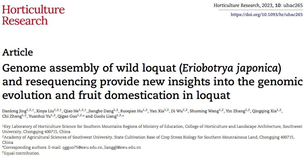 近日,学院枇杷团队的野生枇杷高质量基因组和种质资源重测序研究成果,发表在园艺学国际顶刊、中国科技期刊卓越行动计划领军期刊《Horticulture Research》。该研究为枇杷基因组进化、种质资源多样性和果实驯化提供了新见解。