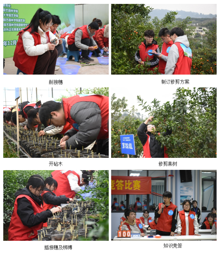 和四川农业大学园艺专业本科同学,经过为期1个多月的专业技能培训和初选,最终共有36位同学成功晋级此次大赛,共分为12个小组,每组3名选手。为加强对学生理论与实践的共同培养,此次大赛共分为“技能比拼”和“知识竞答”两个版块。根据果树育苗和栽培管理中的核心技术需求,“技能比拼”环节分为柑橘幼苗切接与和柑橘结果树修剪两个项目,分别考核选手单芽切接的操作熟练性和规范性以及对果树现状的评估能力和对修剪方法的灵活运用能力。比赛过程中,参赛选手们聚精会神,各展风采,充分体现了园艺学子的精湛技艺与匠心精神。“知识竞答”版块由个人必答、团队必答和团队抢答三个版块组成,选手们踊跃答题,充分展示了园艺学子扎实的理论基础和良好的团队协作能力,现场氛围非常热烈,评审专家的精彩点评更是将大赛推向另一个高潮。