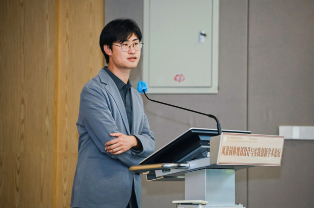 张斌教授从当下设计形式“程式化”、AI创造力进步等现象出发,对风景园林设计实践的未来展开了思考与讨论,他认为行业现状需要更多有热忱的同行者们拓宽发展边界。张斌引用劳瑞·欧林有关设计形式的表述,指出文化是形式表达的重要来源,并从设计者与使用者两种角度展开讨论了设计形式的价值。随后,张斌以华中农业大学“乐乐园”“伴山园”两处校园景观实践案例为例,对如何自然生动的表达中国园林设计思维、如何将形式与功能良好结合展开了详细论述。