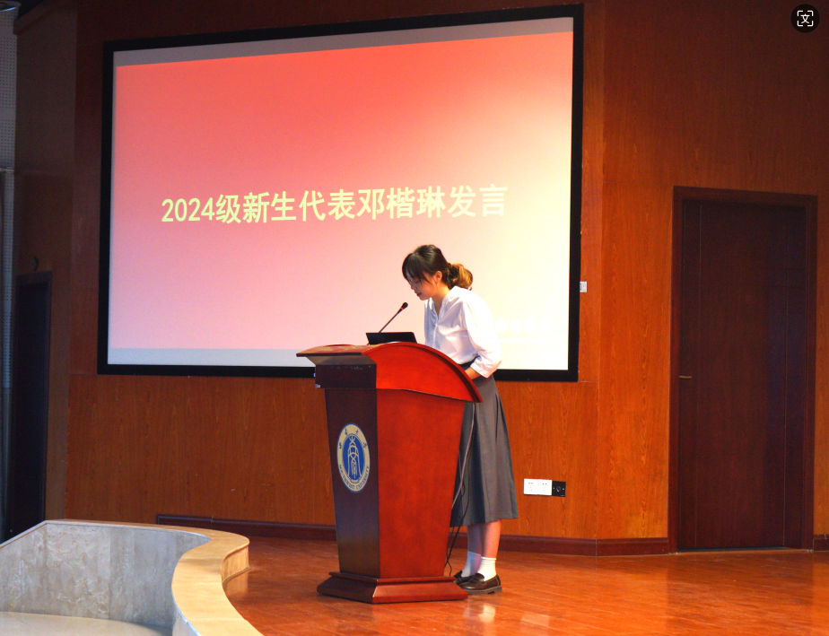 新生代表邓楷琳在发言中首先向辛勤耕耘在教育一线的老师们致以了最崇高的敬意,随后阐述了她对院训“法自然,公天下”的感悟,她认为电影先生