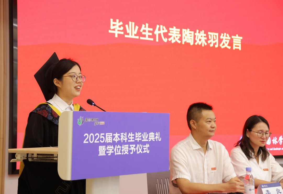 毕业生代表、2025届风景园林专业陶姝羽代表全体毕业生发言。她分享了自己扎根成长的大学生活,向母校、老师和同学表达感谢,向袁隆平院士、吴明珠院士等优秀校友们表达了崇高的敬意。她以“变革中的坚守”的感悟,呼吁每一位毕业生像种子般静待破土,像根系般向下深扎,像年轮般向内生长。在四季轮转中等待花开,在时光流转中守候答案。在变革的时代里,始终怀揣梦想,勇敢前行。教师代表辛儒鸿副教授则希望广大青年学子胸怀家国,永葆对初心的热爱和坚守;知行合一,永葆对事业的热爱和坚守;无惧风雨,永葆对生活的热爱和坚守。