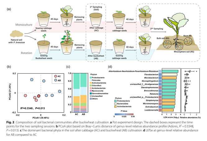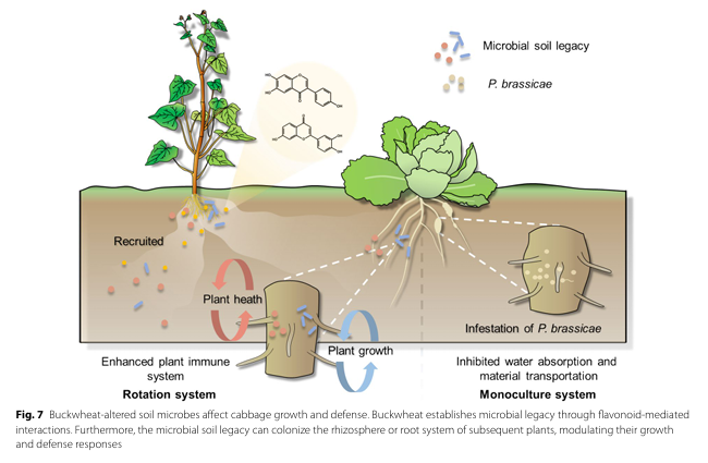 近日,学院司军教授、宋洪元研究员联合南京农业大学袁军教授团队在国际微生物组权威期刊Microbiome发表了题为Soil microbial legacy mediated by buckwheat flavonoids enhances cabbage resistance to clubroot disease的研究论文。该研究系统阐明了荞麦通过分泌特定黄酮类物质,重塑土壤微生物群落,并增强后茬甘蓝对根肿病抗性的机制,为构建精准化的绿色轮作模式提供了理论依据和实践路径。