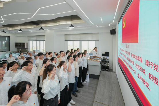 “我志愿加入中国共产党,拥护党的纲领,遵守党的章程……”32名新党员佩戴党员徽章,高举右拳,整齐列队,面向鲜红的党旗,庄严进行入党宣誓。