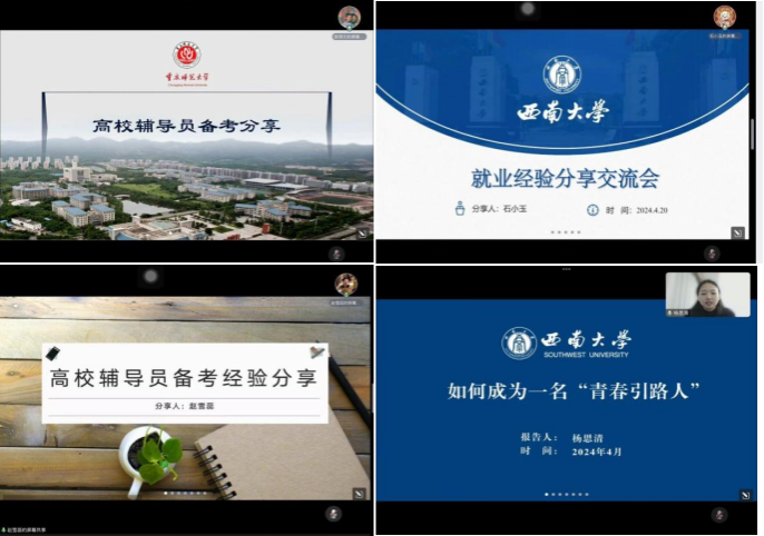 本期活动邀请到四位优秀毕业生榜样为在校生进行经验分享,分别是陈得文,2016级果树学专业研究生、现为重庆师范大学辅导员;石小玉,2020级化学专业研究生、现为电影先生