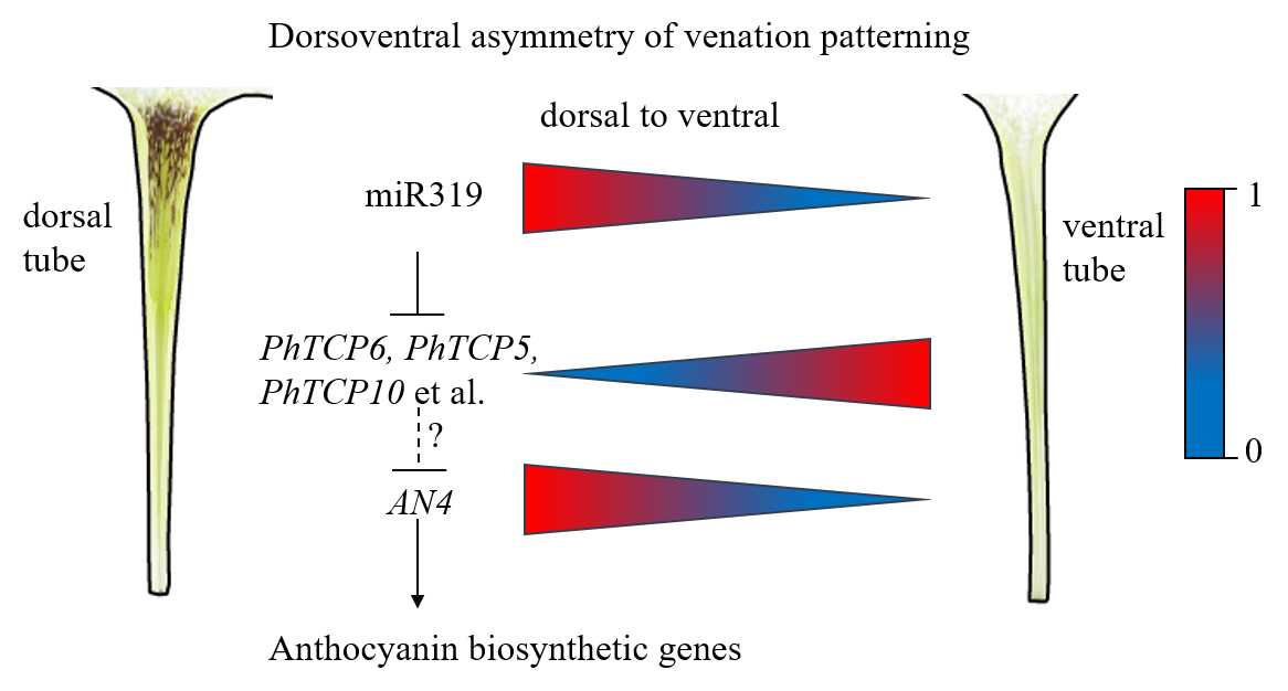 基于上述研究结果,研究团队提出矮牵牛花冠筒条纹背腹侧不对称分布的分子机制:在花冠筒背侧,高表达的miR319抑制了靶基因TCPs的表达,导致AN4基因表达量提高,从而促进条纹在背侧形成;在花冠筒腹侧,低表达的miR319未能抑制靶基因TCPs的表达,导致AN4基因表达量降低,从而抑制条纹在腹侧形成。