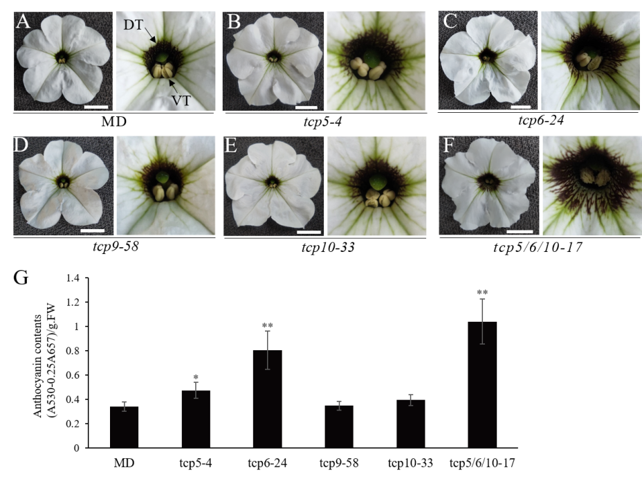 研究发现:miR319在花冠筒背腹侧存在不对称表达模式,背侧表达量高于腹侧;而其靶基因PhTCP5, PhTCP6PhTCP10则呈现相反表达模式。过表达miR319可以促进条纹在花冠筒背腹侧均匀分布,而过表达靶基因PhTCP6可以抑制花冠筒条纹形成。在phtcp6单基因突变体中条纹在背腹侧都显著增强,在phtcp5/6/10三基因突变体中条纹在背腹侧增强更加明显。以上结果表明:miR319靶基因具有抑制条纹形成的功能,miR319促进条纹形成是通过抑制靶基因表达而实现。此外,进一步研究结果发现:miR319靶基因抑制花冠筒条纹形成是通过抑制条纹形成关键基因AN4表达。