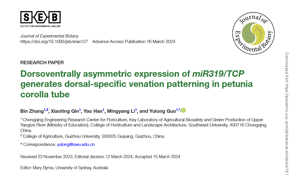 近日,郭余龙研究员团队在Journal of Experimental Botany期刊上发表题为Dorsoventrally asymmetric expression of miR319/TCP generates dorsal-specific venation patterning in petunia corolla tube (//doi.org/10.1093/jxb/erae127) 的研究论文,该研究解析了条纹在矮牵牛花冠筒背腹侧差异分布的分子机制。