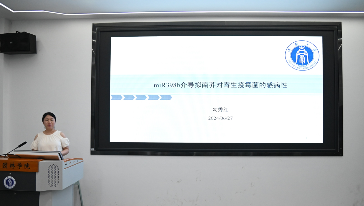 青年教师勾秀红。勾秀红以“miR398b介导拟南芥对寄生疫霉菌的感病性”为题,阐述了拟南芥内源miR398b通过调控植物免疫正调控因子AtC2GnT、CSD1和CSD2的表达,介导拟南芥对寄生疫霉菌感病性的作用机制。此外,还分享了有益微生物在提升枇杷抗病性中的探索性应用。在互动提问环节,勾秀红和与会师生就瞬时表达体系和稳定遗传转化体系在科研中的应用,以及植物与微生物的共进化进行了深入交流。
